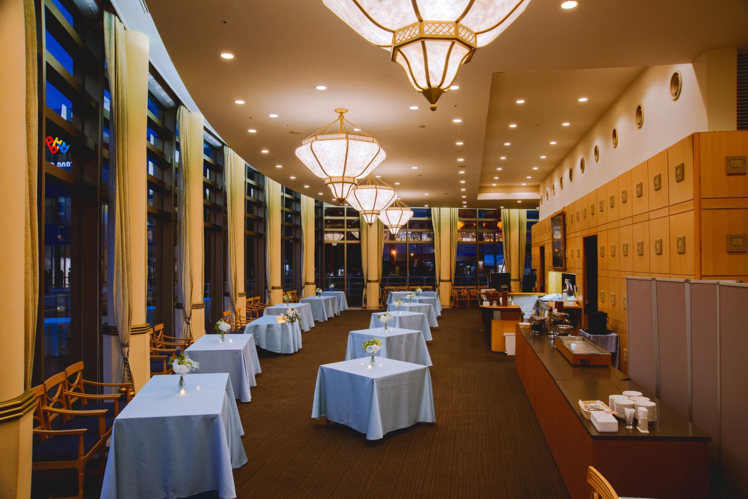 桜木町駅から徒歩10分。ホテルナビオス横浜1階のRestaurantOcean(オーシャン)は、船をモチーフとした天井高・ガラス張りのビュッフェレストランです。着席70名・立食130名までの貸切パーティーにてご利用いただけます。お昼は日の光が降り注ぐ開放感抜群の空間に、夜はみなとみらいの夜景がワンランク上の大人の雰囲気を演出します。